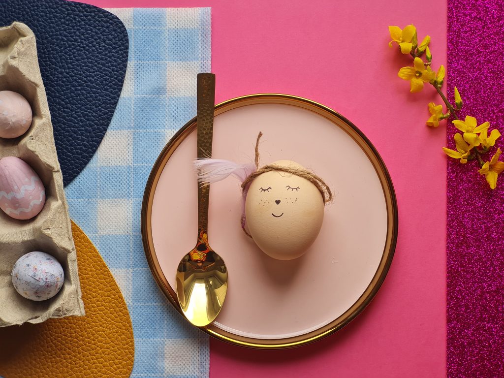 Na pierwszy rzut idzie różowa stylizacja. Wykorzystałam różowy karton (z bloku technicznego), różowy karton z brokatem (dział papierniczy w markecie), ściereczkę w kratkę, malutkie ozdobne jajka też z marketu z działu papierniczego, różowy talerzyk, złota łyżeczka i skórzane podkładki (te wszystkie rzeczy z Homla) oraz gałązka forsycji (własna hodowla 🙂