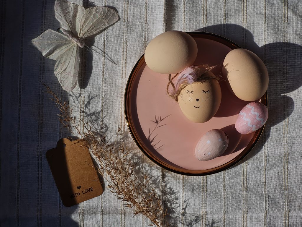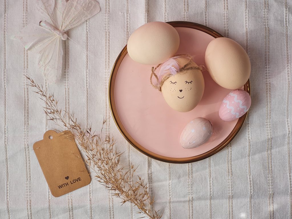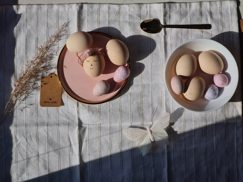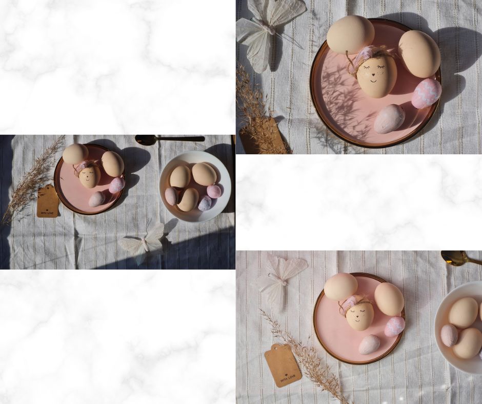 Druga inspiracja to bardzo prosty, minimalny kadr. Jedno ozdobione jajko – jedno zdjęcie lekko tyłem, a drugie bokiem do światła z okna. Jako tło posłużył mi biały papier. Na filmie zobaczysz dodatkowo jak można rozjaśnić zwykłą białą kartką ciemniejsze partie, albo dodać delikatnej poświaty w innym kolorze (tu akurat różowy).