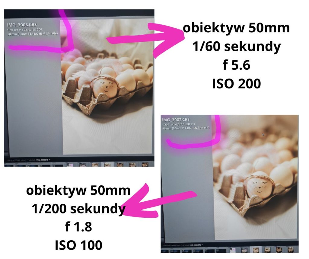 Wszystkie zdjęcia tu zrobiłam telefonem. Aparatem kilka kadrów, żeby pokazać Ci, że można to zrobić też na dużej przysłonie (tu dla porównania 1.8 i 5.6), bo często widzę rozmowy, że słabym obiektywem się czegoś nie da. No dużo się da i na pewno da się zrobić takie zdjęcie i to jeszcze z rozmyciem. Tylko rób to pod kątem czyli nie z góry, ale tak około 45 stopni i wtedy reszta jajek będzie tworzyć tło.