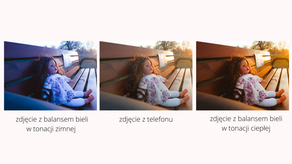 Jako przykład pokażę Ci lalkę mojej córki 🙂 Zdjęcie w środku to zdjęcie, które wyszło prosto z mojego telefonu. Po lewej stronie zdjęcie, gdzie zmieniłam balans bieli na lekko niebieski. Po prawej obrobione zdjęcie z dodatkiem cieplejszego balansu bieli. Prawda, że widać różnicę? Lalka w niebieskich kolorach ma zupełnie inny odbior niż ta podczas ciepłego, zachodzącego słońca.